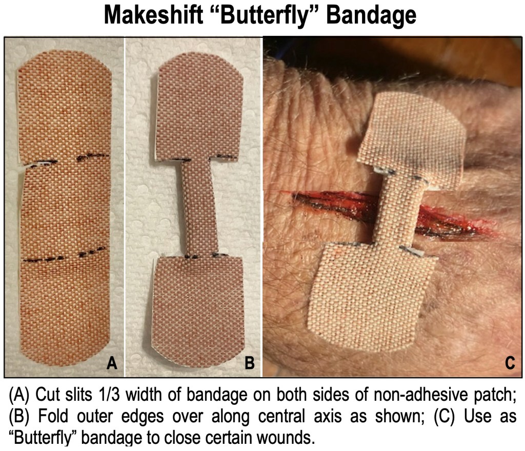 I go through countless bandaids each year, either for my own wound covering or in response to myriad cuts and scraps to those around me. Besides the common one-inch adhesive bandage we all know, the butterfly bandage comes in a close second for being a great wound sealer of back-country cuts – and consequently is constantly in need of re-supply in my kit. Since the regular adhesive strip is usually more plentiful, it’s convenient to make a butterfly-type bandage from the common bandaid.